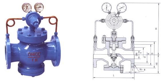 上海霜恒閥門(mén)有限公司專(zhuān)業(yè)生產(chǎn)的YK43H氣體減壓閥屬于先導活塞式減壓閥,由主閥和導閥兩部分組成,主閥主要由閥座、主閥盤(pán)、活塞、彈簧等零件組成,導閥主要由閥座、閥瓣、膜片、彈簧、調節彈簧等零件組成。通過(guò)調節調節彈簧壓力設定出口壓力、利用膜片傳感出口壓力變化,通過(guò)導閥啟閉驅動(dòng)活塞調節主閥節流部位過(guò)流面積的大小,實(shí)現減壓穩壓功能。YK43H氣體減壓閥主要用于氣體管路,如空氣、氮氣、氧氣、氫氣、液化氣、天然氣等氣體。 |